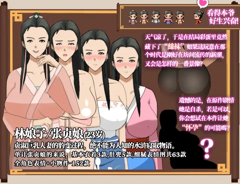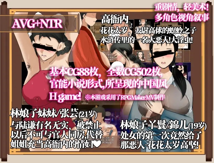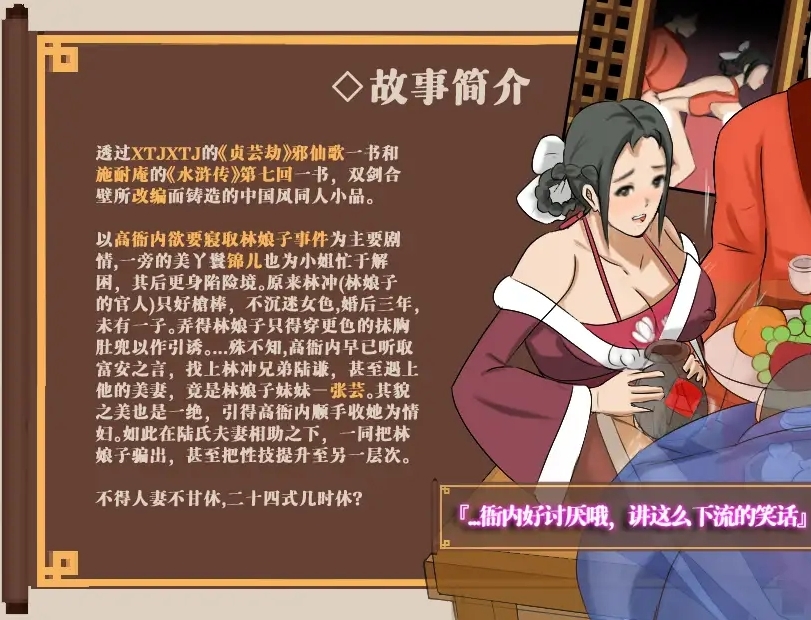 『清平世界,是何道理把良人调戏?』『调戏良人妻子当得何罪!』出场角色张芸 张教头二女儿,陸谦的新婚妻子(芳龄21)张贞娘 张教头大女儿,林冲的漂亮妻子(芳龄23)錦儿 张貞娘的丫鬟,暗恋对象药商张甑(芳龄19)※所用[音频][CV青梅]村『恶少挑动春情欲,绿帽难遮云雨心。』富安巧妙献计,张芸的大胆,陆谦的委屈,錦儿的处女膜八十万禁军教头豹子头-林冲,那不足为外人道的事儿!本作把高衙内与林娘子不为人知的秘密藏在游戏里…故事改编自…作者1 XTJXTJ 《水浒揭秘(贞芸劫)》- 邪仙歌作者2,3,4 施耐庵 /罗贯中 /金圣叹 《水滸傳》……事件以风雪山神廟林冲怒杀陆谦王八作为倒叙开端实际上以高衙内与林娘子试那云雨二十四式为主要事件。(这秘密。笔者请诸位大人不要告诉林冲,否则…你我性命不保。)